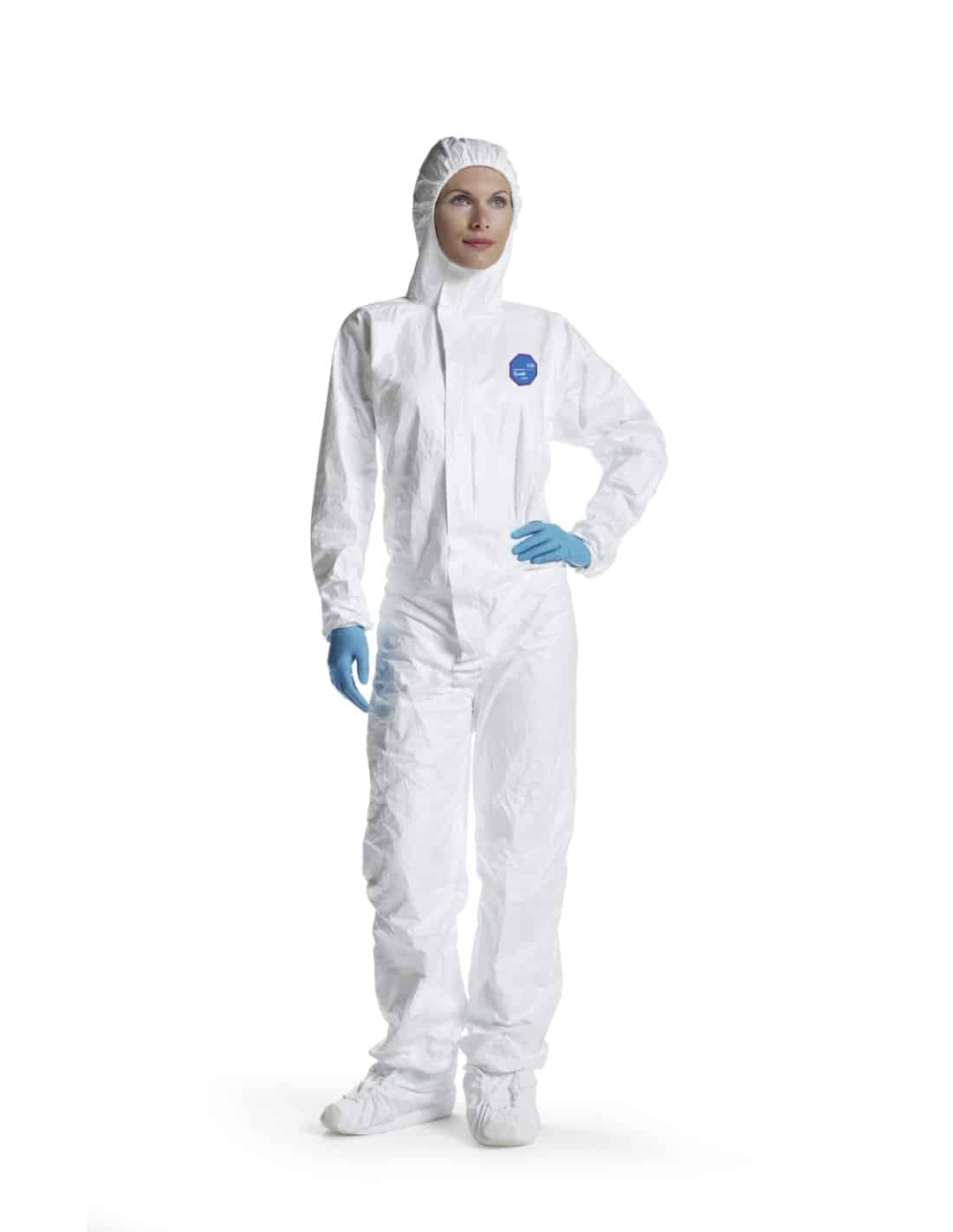 DuPont™ Tyvek® 500 Labo. Tuta con cappuccio e copriscarpe antiscivolo fissati. Cuciture interne rinforzate. Polsi, caviglie e viso elasticizzati (elastico integrato). Elastico in vita (incollato). Zip e patta in Tyvek®. Bianca.
